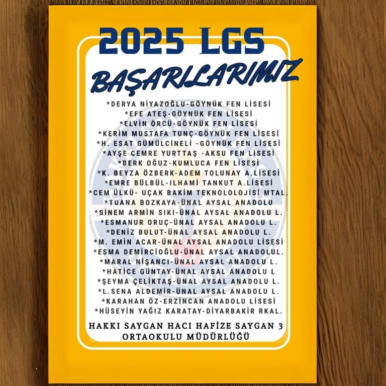 Aşağıdaki fotoğrafta 2025 LGS sonucunda başarı elde eden öğrencilerimizin listesi bulunmaktadır. Tüm öğrencilerimizi tebrik ederiz.